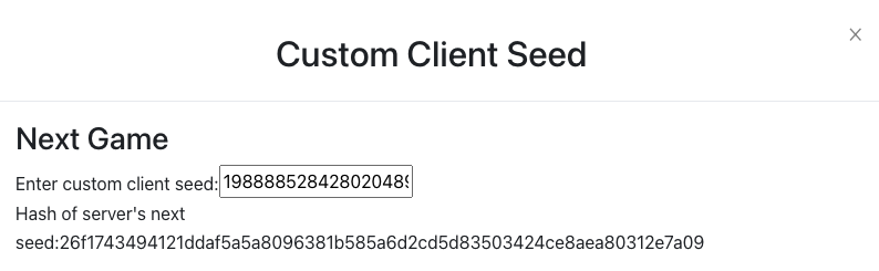 يمكنك التحقق من هذا في أي عدد من الألعاب التي تريدها، ومع أي عدد من تنويعات البذرة المخصصة للعميل – ستجد أنه عند التحقق، تكون النتيجة الناتجة عن البذرة المخصصة للعميل وبذرة الخادم دائمًا هي نفس التجزئة المعروضة قبل بدء اللعبة.